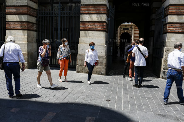Légende : Toulouse, le 28 juin 2020 - Un vigile controle les sacs des electeurs a l'entree du bureau de vote du Capitole a Toulouse le jour du second tour des elections muncipales a Toulouse. PHOTO: Vincent NGUYEN / Riva Press pour Le Monde