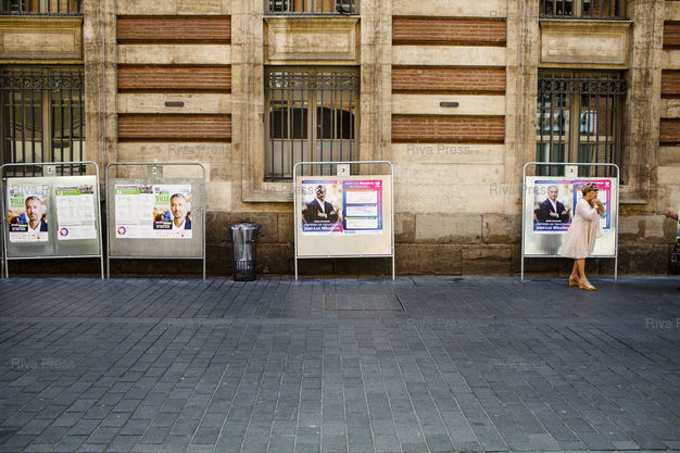 Légende : Toulouse, le 28 juin 2020 - Des passants devant des affichent electorales aux abords du Capitole le jour du second tour des elections muncipales a Toulouse. PHOTO: Vincent NGUYEN / Riva Press pour Le Monde