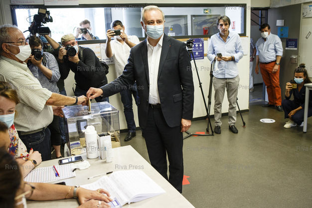 Légende : Toulouse, le 28 juin 2020 - Jean-Luc Moudenc, maire sortant LR vote a Toulouse le jour du second tour des elections muncipales a Toulouse. PHOTO: Vincent NGUYEN / Riva Press pour Le Monde