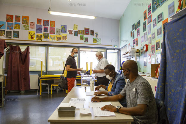 Légende : Toulouse, le 28 juin 2020 - Le president (C), la secretaire (G) et les assesseurs d'un bureau de vote a Toulouse le jour du second tour des elections muncipales a Toulouse. PHOTO: Vincent NGUYEN / Riva Press pour Le Monde
