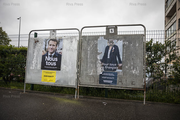 Légende : Toulouse, le 24 avril 2022 - Panneaux électoraux d'Emmanuel Macron et de Marione Le Pen à proximité d'un bureau de vote au nord de Toulouse le jour du second tour de l'élection présidentielle.
