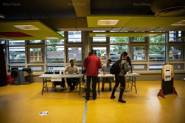 Légende : Toulouse, le 24 avril 2022 - Des électeurs votent dans un bureau de vote au nord de Toulouse le jour du second tour de l'élection présidentielle.