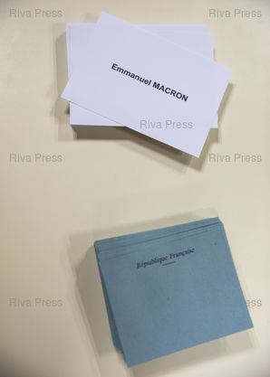 Légende : Toulouse, le 24 avril 2022 - Bulletins de vote pour Emmanuel Macron dans un bureau de vote au nord de Toulouse le jour du second tour de l'élection présidentielle.