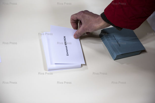 Légende : Toulouse, le 24 avril 2022 - Des électeurs prennent les bulletins pour voter dans un bureau de vote au nord de Toulouse le jour du second tour de l'élection présidentielle.
