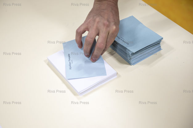 Légende : Toulouse, le 24 avril 2022 - Des électeurs prennent les bulletins pour voter dans un bureau de vote au nord de Toulouse le jour du second tour de l'élection présidentielle.