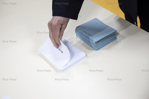 Légende : Toulouse, le 24 avril 2022 - Des électeurs prennent les bulletins pour voter dans un bureau de vote au nord de Toulouse le jour du second tour de l'élection présidentielle.