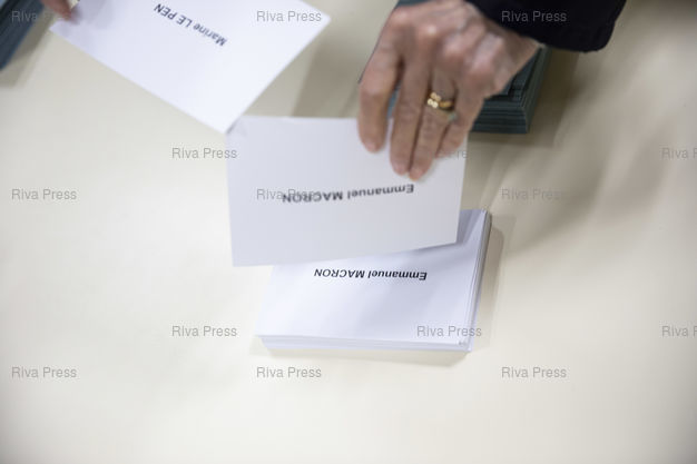 Légende : Toulouse, le 24 avril 2022 - Des électeurs prennent les bulletins pour voter dans un bureau de vote au nord de Toulouse le jour du second tour de l'élection présidentielle.