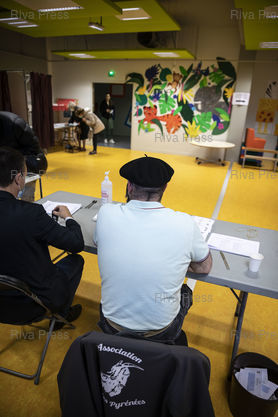 Légende : Toulouse, le 24 avril 2022 - Un assesseur accueille les électeurs dans un bureau de vote au nord de Toulouse le jour du second tour de l'élection présidentielle.