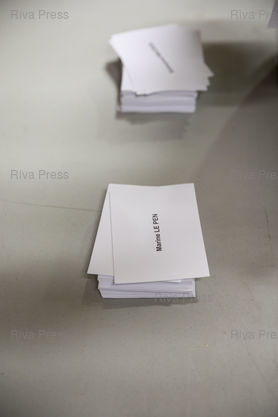 Légende : Toulouse, le 24 avril 2022 - Les bulletins de vote dans un bureau de vote au nord de Toulouse le jour du second tour de l'élection présidentielle.