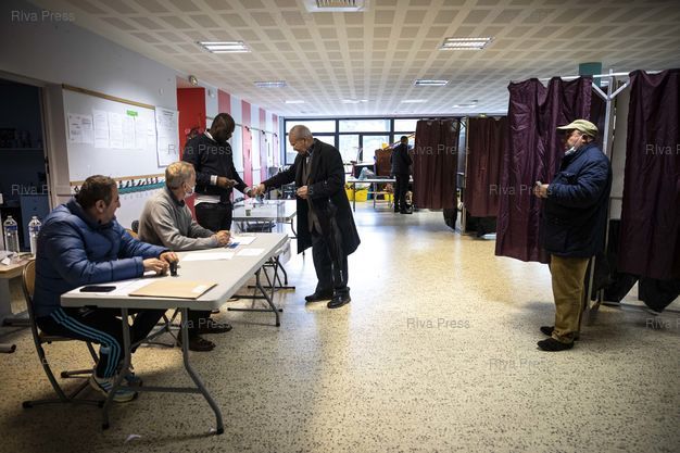 Légende : Toulouse, le 24 avril 2022 - Des électeurs votent dans un bureau de vote situé dans le quartier du Mirail à Toulouse le jour du second tour de l'élection présidentielle.