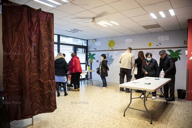 Légende : Toulouse, le 24 avril 2022 - Des électeurs votent dans un bureau de vote situé dans le quartier du Mirail à Toulouse le jour du second tour de l'élection présidentielle.