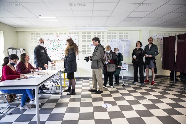 Légende : Toulouse, le 24 avril 2022 - Des électeurs votent dans un bureau de vote du quartier résidentiel de La Côte Pavée à Toulouse le jour du second tour de l'élection présidentielle.
