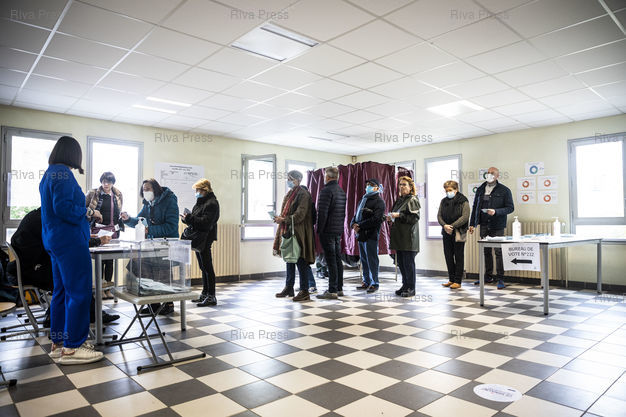 Légende : Toulouse, le 24 avril 2022 - Des électeurs votent dans un bureau de vote du quartier résidentiel de La Côte Pavée à Toulouse le jour du second tour de l'élection présidentielle.