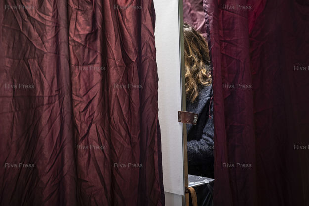 Légende : Toulouse, le 24 avril 2022 - Des électeurs dans l'isoloir votent dans un bureau de vote du quartier résidentiel de La Côte Pavée à Toulouse le jour du second tour de l'élection présidentielle.