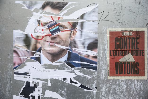 Légende : Toulouse, le 24 avril 2022 - Affiche électorale déchirée d'Emmanuel Macron et Une du journal Libération appelant à voter Emmanuel Macron pour faire barrage à l'extrême droite sur un panneau électoral situé à proximité d'un bureau de vote du quartier Saint-Cyprien à Toulouse le jour du second tour de l'élection présidentielle.