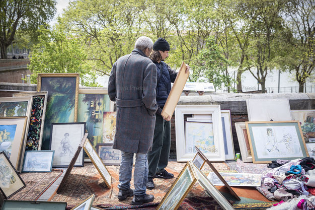 Légende : Toulouse, le 24 avril 2022 - Mohamed (G) tient un stand de tableaux au vide-grenier de la Daurade, Place de la Daurade à Toulouse le jour du second tour de l'élection présidentielle.