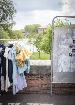 Légende : Toulouse, le 24 avril 2022 - Panneau électoral recouvert de stickers promotionnels le long de la Garonne où se tient le vide-grenier de la Daurade, Place de la Daurade à Toulouse le jour du second tour de l'élection présidentielle.