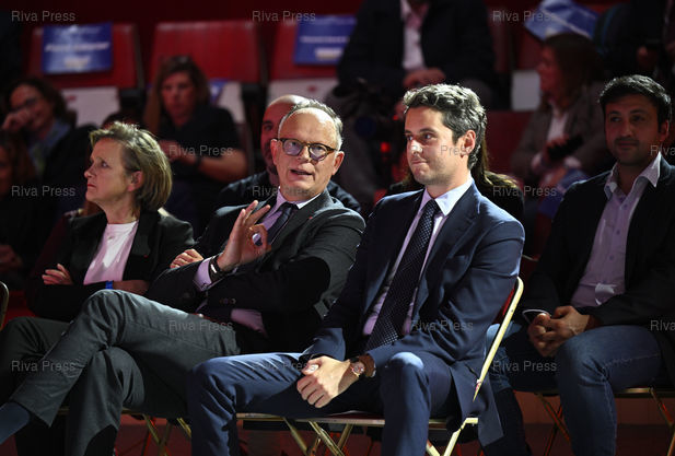 Légende : Meeting de Pierre-Yves Bournazel, candidat à la mairie de Paris investi par les partis Renaissance et Horizons. Edouard Philippe et Gabriel Attal /// Meeting of Pierre-Yves Bournazel, candidate for mayor of Paris endorsed by the Renaissance and Horizons parties. Edouard Philippe and Gabriel Attal, former prime ministers - Paris - 10/02/2026 - Photo © Lionel Préau +33 (0)6 68 12 83 77