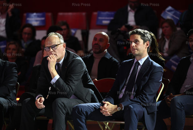 Légende : Meeting de Pierre-Yves Bournazel, candidat à la mairie de Paris investi par les partis Renaissance et Horizons. Edouard Philippe et Gabriel Attal /// Meeting of Pierre-Yves Bournazel, candidate for mayor of Paris endorsed by the Renaissance and Horizons parties. Edouard Philippe and Gabriel Attal, former prime ministers - Paris - 10/02/2026 - Photo © Lionel Préau +33 (0)6 68 12 83 77