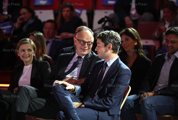 Légende : Meeting de Pierre-Yves Bournazel, candidat à la mairie de Paris investi par les partis Renaissance et Horizons. Edouard Philippe et Gabriel Attal /// Meeting of Pierre-Yves Bournazel, candidate for mayor of Paris endorsed by the Renaissance and Horizons parties. Edouard Philippe and Gabriel Attal, former prime ministers - Paris - 10/02/2026 - Photo © Lionel Préau +33 (0)6 68 12 83 77