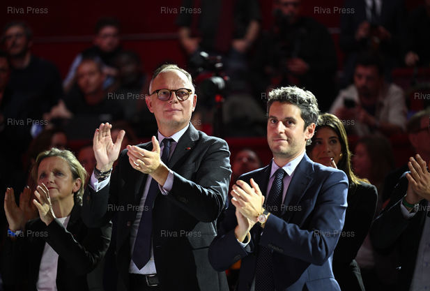 Légende : Meeting de Pierre-Yves Bournazel, candidat à la mairie de Paris investi par les partis Renaissance et Horizons. Edouard Philippe et Gabriel Attal /// Meeting of Pierre-Yves Bournazel, candidate for mayor of Paris endorsed by the Renaissance and Horizons parties. Edouard Philippe and Gabriel Attal, former prime ministers - Paris - 10/02/2026 - Photo © Lionel Préau +33 (0)6 68 12 83 77