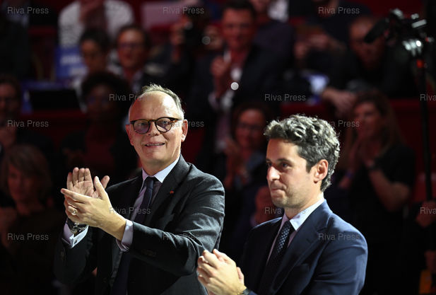 Légende : Meeting de Pierre-Yves Bournazel, candidat à la mairie de Paris investi par les partis Renaissance et Horizons. Edouard Philippe et Gabriel Attal /// Meeting of Pierre-Yves Bournazel, candidate for mayor of Paris endorsed by the Renaissance and Horizons parties. Edouard Philippe and Gabriel Attal, former prime ministers - Paris - 10/02/2026 - Photo © Lionel Préau +33 (0)6 68 12 83 77
