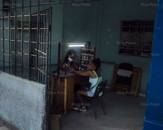Légende : Une habitante de La Havane a installé un salon de manucure dans le hall de son immeuble. La Havane, Cuba. 13 janvier 2026. © Lucien Lung / Riva Press *** A Havana resident has set up a manicure salon in the lobby of her apartment building. Havana, Cuba. January 13, 2026. © Lucien Lung / Riva Press