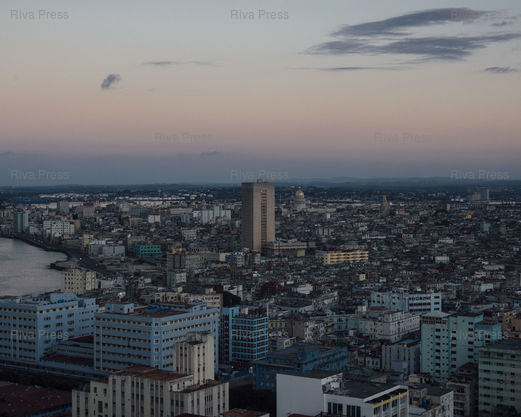 Légende : Vue sur le centre-ville de la Havane. Au centre, l l'hôpital Hermanos Ameijeiras, le plus important de La Havane, à l'arrière-plan, le Capitole. Cuba, le 4 janvier 2026. © Lucien Lung / Riva Press *** View of the Malecón and the Vedado district. In the center, the U.S. Embassy building, with the anti-imperialist platform to its right. Havana, Cuba, January 4, 2026. © Lucien Lung / Riva Press