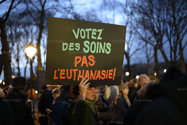 Légende : Rassemblement contre le texte sur la fin de vie, alors que les débats reprennent à l'Assemblée nationale sur la création d'un droit à l'aide à mourir /// Rally against the end-of-life bill, as debates resume in the National Assembly on the creation of a right to assisted dying - Paris - 16/02/2026 - Photo © Lionel Préau +33 (0)6 68 12 83 77