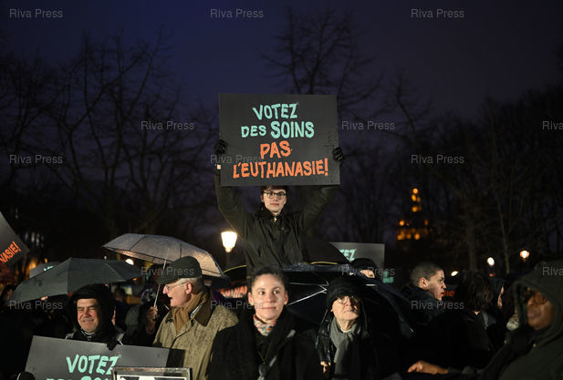 Légende : Rassemblement contre le texte sur la fin de vie, alors que les débats reprennent à l'Assemblée nationale sur la création d'un droit à l'aide à mourir /// Rally against the end-of-life bill, as debates resume in the National Assembly on the creation of a right to assisted dying - Paris - 16/02/2026 - Photo © Lionel Préau +33 (0)6 68 12 83 77