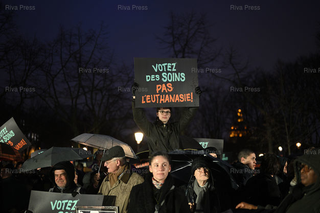 Légende : Rassemblement contre le texte sur la fin de vie, alors que les débats reprennent à l'Assemblée nationale sur la création d'un droit à l'aide à mourir /// Rally against the end-of-life bill, as debates resume in the National Assembly on the creation of a right to assisted dying - Paris - 16/02/2026 - Photo © Lionel Préau +33 (0)6 68 12 83 77