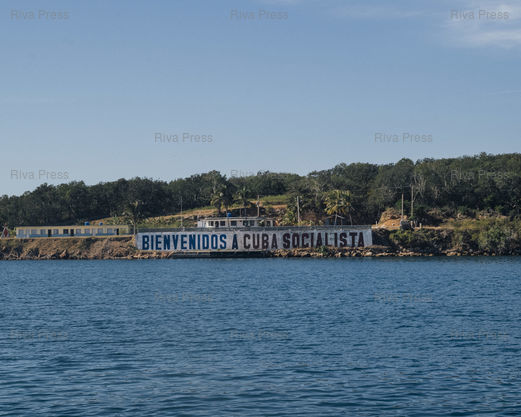 Légende : 'Bienvenue à Cuba socialiste', dans la baie de Cienfuegos, entre Jagua et Ciudad Nuclear. Cuba, le 11 janvier 2026. © Lucien Lung / Riva Press *** 'Welcome to Socialist Cuba', in the bay of Cienfuegos, between Jagua and Ciudad Nuclear. Cuba, January 11, 2026. © Lucien Lung / Riva Press
