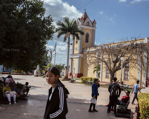 Légende : Des habitants d'Artemisa installés sur la place du centre-ville, devant l'église. Artemisa, Cuba, le 7 janvier 2026. © Lucien Lung / Riva Press *** Residents of Artemisa gathered in the town square, in front of the church. Artemisa, Cuba, January 7, 2026. © Lucien Lung / Riva Press