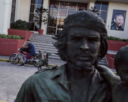 Légende : Un agent de la sécurité en civil surveille les visiteurs de la 'Statue du Che avec enfant', devant le siège provincial du Parti communiste de Cuba. Santa Clara, Cuba, le 9 janvier 2026. © Lucien Lung / Riva Press *** A plainclothes security officer monitors visitors to the 'Statue of Che with Child', in front of the provincial headquarters of the Communist Party of Cuba. Santa Clara, Cuba, January 9, 2026. © Lucien Lung / Riva Press