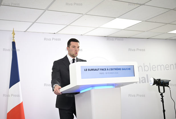 Légende : Jordan Bardella, président du RN, s'exprime après la mort du militant nationaliste Quentin Deranque, mettant en cause l'extrême gauche et la responsabilité de la France Insoumise /// Jordan Bardella, president of the Rassemblement National, speaks out after the death of nationalist activist Quentin Deranque, blaming the far left and the responsibility of La France Insoumise - Paris - 18/02/2026 - Photo © Lionel Préau +33 (0)6 68 12 83 77