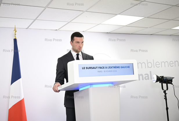 Légende : Jordan Bardella, président du RN, s'exprime après la mort du militant nationaliste Quentin Deranque, mettant en cause l'extrême gauche et la responsabilité de la France Insoumise /// Jordan Bardella, president of the Rassemblement National, speaks out after the death of nationalist activist Quentin Deranque, blaming the far left and the responsibility of La France Insoumise - Paris - 18/02/2026 - Photo © Lionel Préau +33 (0)6 68 12 83 77