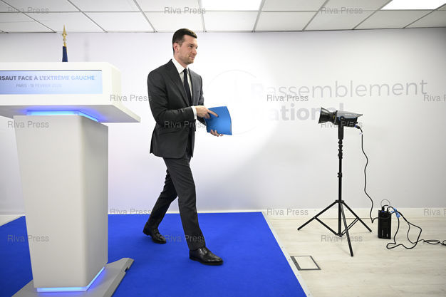 Légende : Jordan Bardella, président du RN, s'exprime après la mort du militant nationaliste Quentin Deranque, mettant en cause l'extrême gauche et la responsabilité de la France Insoumise /// Jordan Bardella, president of the Rassemblement National, speaks out after the death of nationalist activist Quentin Deranque, blaming the far left and the responsibility of La France Insoumise - Paris - 18/02/2026 - Photo © Lionel Préau +33 (0)6 68 12 83 77