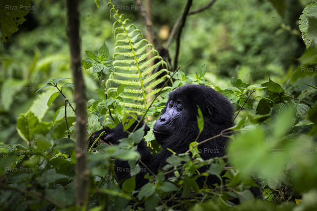 Légende : Un gorille de montagne du groupe Bweza dans le parc national Bwindi Impenetrable Forrest a l'Ouest de l'Ouganda. Le 31/10/2024 /// A mountain gorilla from the Bweza group in Bwindi Impenetrable Forest National Park in western Uganda. On October 31, 2024 /// PHOTO Vincent Boisot