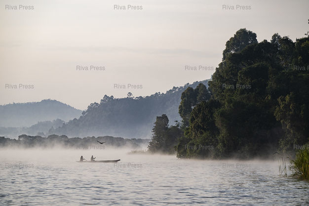Légende : Le lac Mutanda en Ouganda au petit matin. Le 01/11/2024 /// Lake Mutanda in Uganda at dawn. On November 1, 2024 /// PHOTO Vincent Boisot