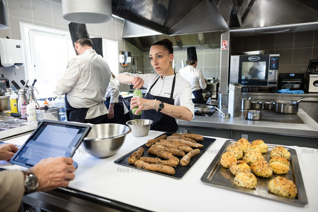 Légende : Coline Faulquier, cheffe du nouveau restaurant l'Auffo (anciennement l'Epuisette) au Vallon des Auffes a Marseille, le 23 Avril 2025, en action avec ses equipes et dans sa cuisine ***** Coline Faulquier, head chef of the new restaurant l'Auffo (formerly l'Epuisette) in the Vallon des Auffes, April 23, 2025, in Marseille, working with her team and in her kitchen ***** PHOTO : CLEMENT MAHOUDEAU / RIVA PRESS ///