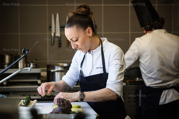 Légende : Coline Faulquier, cheffe du nouveau restaurant l'Auffo (anciennement l'Epuisette) au Vallon des Auffes a Marseille, le 23 Avril 2025, en action avec ses equipes et dans sa cuisine ***** Coline Faulquier, head chef of the new restaurant l'Auffo (formerly l'Epuisette) in the Vallon des Auffes, April 23, 2025, in Marseille, working with her team and in her kitchen ***** PHOTO : CLEMENT MAHOUDEAU / RIVA PRESS ///