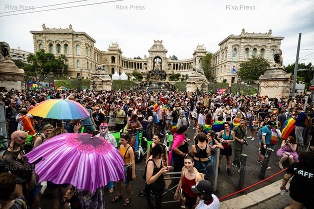 Légende : Reportage lors de la Pride dans les rues de Marseille le 06 juillet 2024 ***** Pride march in Marseille streets on July 6, 2024 ***** PHOTO : CLEMENT MAHOUDEAU / RIVA PRESS