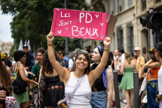 Légende : Reportage lors de la Pride dans les rues de Marseille le 06 juillet 2024. Un participant tient une pancarte "Les PD sont beaux" ***** Pride march in Marseille streets on July 6, 2024. A participant holds a sign reading "Gays are beautiful" ***** PHOTO : CLEMENT MAHOUDEAU / RIVA PRESS