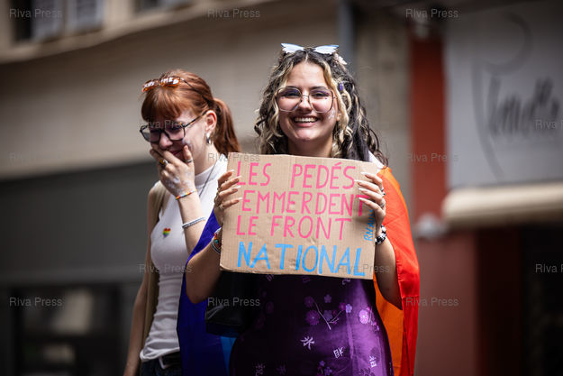 Légende : Reportage lors de la Pride dans les rues de Marseille le 06 juillet 2024. Un participant tient une pancarte "Les pedes emmerdent le front national" ***** Pride march in Marseille streets on July 6, 2024. A participant holds a sign reading "Gays piss off the Front National" ***** PHOTO : CLEMENT MAHOUDEAU / RIVA PRESS
