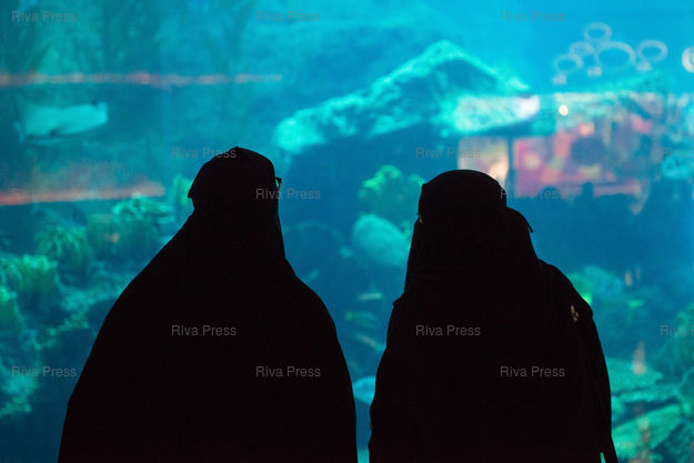 Légende : Deux Femmes portent le niqab a l'aquarium de Dubai, Emirats Arabes Unis, le 2 avril 2015 ***** Women wearing burka in Dubai aquarium United Arab Emirates, 02 April 2015 ***** PHOTO : CLEMENT MAHOUDEAU / RIVA PRESS