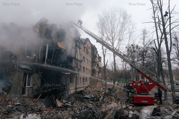 Légende : Un batiment residentiel du nord-est de Kharkiv en Ukraine detruit par un missile balistique tire par la Russie dans la nuit du 6 au 7 mars 2026. L'attaque a tue au moins 11 personnes dont 2 enfants. Selon le procureur regional de Kharkiv, la Russie aurait utilise un nouveau type de missile nomme "Izdeliye-30", une version modernisee du missile de croisiere Kh-101. Kharkiv, 7 mars 2026. Teo Manisier / Riva Press /// A residential building destroyed by a Russian ballistic missile in nordeast Kharkiv, Ukraine, in the night of the 6th-7th March 2026. The attack killed at least 11 including 2 children. According to the regional prosecutor of Kharkiv, Russia allegedly used a new type of missile called "Izdeliye-30", a modernized version of the Kh-101 cruise missile. Kharkiv, March 7th 2026. Teo Manisier / Riva Press