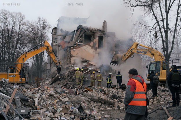Légende : Un batiment residentiel du nord-est de Kharkiv en Ukraine detruit par un missile balistique tire par la Russie dans la nuit du 6 au 7 mars 2026. L'attaque a tue au moins 11 personnes dont 2 enfants. Selon le procureur regional de Kharkiv, la Russie aurait utilise un nouveau type de missile nomme "Izdeliye-30", une version modernisee du missile de croisiere Kh-101. Kharkiv, 7 mars 2026. Teo Manisier / Riva Press /// A residential building destroyed by a Russian ballistic missile in nordeast Kharkiv, Ukraine, in the night of the 6th-7th March 2026. The attack killed at least 11 including 2 children. According to the regional prosecutor of Kharkiv, Russia allegedly used a new type of missile called "Izdeliye-30", a modernized version of the Kh-101 cruise missile. Kharkiv, March 7th 2026. Teo Manisier / Riva Press