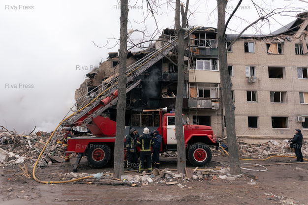 Légende : Un batiment residentiel du nord-est de Kharkiv en Ukraine detruit par un missile balistique tire par la Russie dans la nuit du 6 au 7 mars 2026. L'attaque a tue au moins 11 personnes dont 2 enfants. Selon le procureur regional de Kharkiv, la Russie aurait utilise un nouveau type de missile nomme "Izdeliye-30", une version modernisee du missile de croisiere Kh-101. Kharkiv, 7 mars 2026. Teo Manisier / Riva Press /// A residential building destroyed by a Russian ballistic missile in nordeast Kharkiv, Ukraine, in the night of the 6th-7th March 2026. The attack killed at least 11 including 2 children. According to the regional prosecutor of Kharkiv, Russia allegedly used a new type of missile called "Izdeliye-30", a modernized version of the Kh-101 cruise missile. Kharkiv, March 7th 2026. Teo Manisier / Riva Press