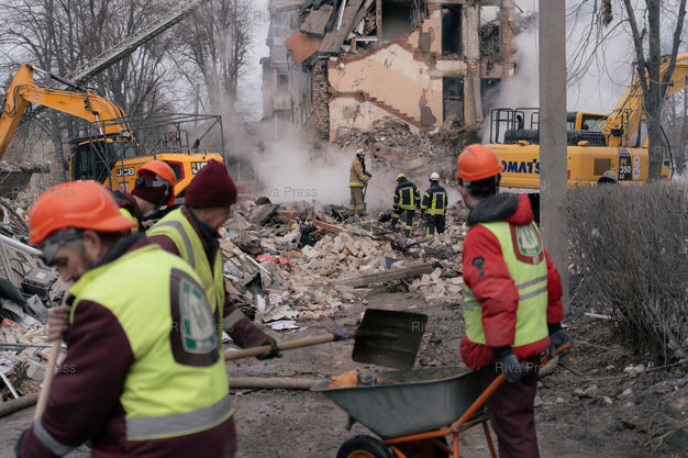 Légende : Un batiment residentiel du nord-est de Kharkiv en Ukraine detruit par un missile balistique tire par la Russie dans la nuit du 6 au 7 mars 2026. L'attaque a tue au moins 11 personnes dont 2 enfants. Selon le procureur regional de Kharkiv, la Russie aurait utilise un nouveau type de missile nomme "Izdeliye-30", une version modernisee du missile de croisiere Kh-101. Kharkiv, 7 mars 2026. Teo Manisier / Riva Press /// A residential building destroyed by a Russian ballistic missile in nordeast Kharkiv, Ukraine, in the night of the 6th-7th March 2026. The attack killed at least 11 including 2 children. According to the regional prosecutor of Kharkiv, Russia allegedly used a new type of missile called "Izdeliye-30", a modernized version of the Kh-101 cruise missile. Kharkiv, March 7th 2026. Teo Manisier / Riva Press