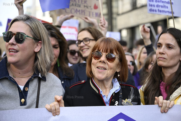 Légende : Manifestation à l'occasion de la Journée internationale des droits des femmes, pour défendre les droits des femmes, dénoncer les violences sexuelles et la montée du conservatisme. Gisèle Pelicot, victime des viols de dizaines d'hommes organisés par son ex-mari et devenue une figure mondiale de la lutte contre les violences sexuelles, et sa fille Caroline Darian, avec la Fondation des femmes. A droite, Anne-Cécile Mailfert, présidente de la Fondation des femmes /// Demonstration on the occasion of International Women's Day, to defend women's rights, denounce sexual violence and the rise of conservatism. Gisèle Pelicot, a victim of rape by dozens of men orchestrated by her ex-husband and who has become a global figure in the fight against sexual violence, and her daughter Caroline Darian, with the Women's Foundation. On the right, Anne-Cécile Mailfert, president of the Women's Foundation - Paris - 08/03/2026 - Photo © Lionel Préau +33 (0)6 68 12 83 77